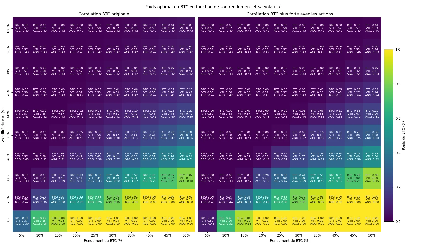 Et là, douche froide : mes préjugés en prennent encore un coup. L’allocation en BTC résiste même avec un rendement en baisse, tant que sa corrélation avec les actions reste modérée (~0,4). Par contre, si cette corrélation passe à 0,8… il disparaît presque complètement du portefeuille optimal, sauf pour les vrais croyants qui supposent des ratios rendements/volatilité largement supérieurs aux actions. Mais dans ce cas, pas besoin d’étude pour le confirmer...