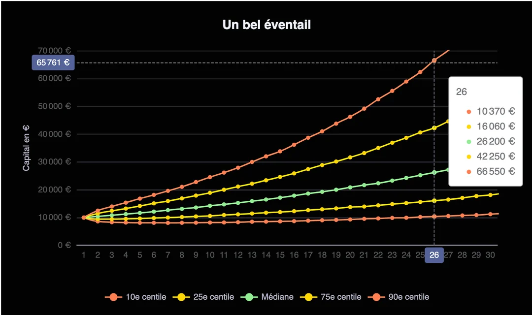 En réalité, au lieu d’une seule belle courbe ascendante de plus en plus raide, la valeur de votre investissement se situera dans un éventail de probabilités :